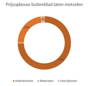 Het metselen van een muur is een tijdrovende en arbeidsintensieve klus, vooral als het een buitenblad betreft met kleine stenen. Je betaalt dus het grootste gedeelte van de totaalprijs voor de arbeidskosten en dit is 75 procent. De materialen nemen vervolgens 23 procent in beslag van de totaalkosten en de voorrijkosten (als die er zijn) gemiddeld 2 procent. Kies je voor een materiaal dat duurder is dan gemiddeld, zoals een natuursteen, dan zal deze verhouding enigszins verschuiven en zullen de materialen meer plaats in beslag gaan nemen. De beste manier om geld te besparen op deze klus is dus door het zelf uit te voeren en hiermee bespaar je maar liefst 77 procent. Of je dit aandurft, is volledig aan jou. Het volgende diagram geeft deze prijsopbouw nogmaals weer, maar dan in grafische vorm.