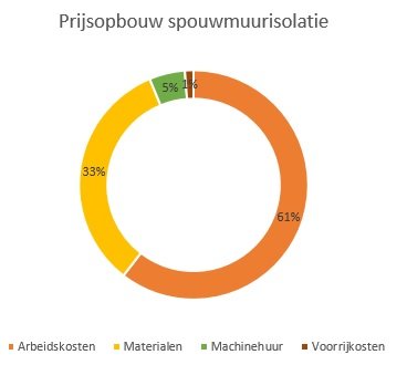 De totaalprijs die je moet betalen voor deze werkzaamheden is uit verschillende onderdelen opgebouwd. Zo zijn er de arbeidskosten die ongeveer 60 procent innemen, de materiaalkosten die goed zijn voor 33 procent, de kosten om de machine te huren nemen 5 procent in beslag en de overige 2 procent is voor eventuele arbeidskosten. Wil je geld besparen, dan kun je dit dus het beste doen door de werkzaamheden zelf uit te voeren. Dit is mogelijk, maar wordt afgeraden. Ten eerste bevinden flats zich vaak op hoogte wat dus gevaarlijk kan zijn en ten tweede moeten de werkzaamheden uitgevoerd worden met gespecialiseerde machines. Wordt dit niet goed gedaan, dan zal de isolatiewaarde ook niet optimaal zijn. De prijsverhouding vind je nogmaals terug in het volgende diagram.