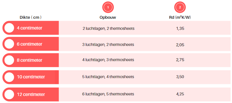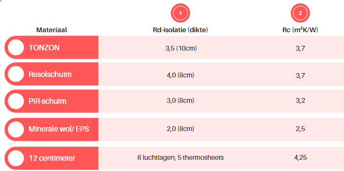 De hierboven besproken techniek van TONZON houdt zowel de warmtestroming en doorstraling tegendoormiddel van geleiding. Wegens de uitzonderlijke techniek die gebruikt wordt, zijn relatief hoge isolatiewaardes te halen. Hieronder vind je een overzicht met daarin de waardes per dikte isolatiemateriaal.